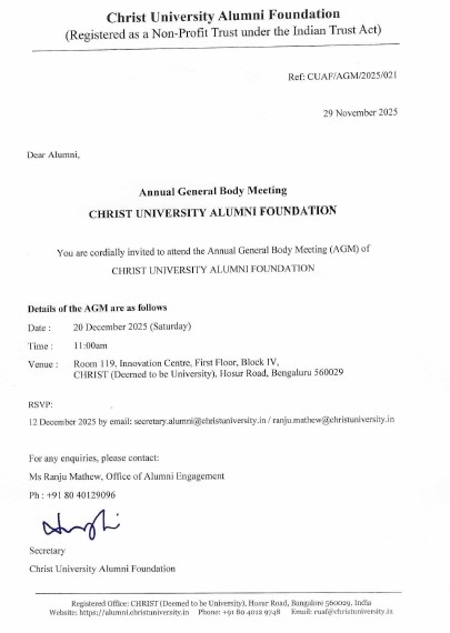 The Christ University Alumni Foundation invites all alumni to attend the Annual General Body Meeting (AGM) on 20 December 2025 at 11:00 AM in Room 119, Innovation Centre, CHRIST (Deemed to be University), Bengaluru.